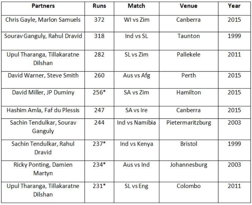 Unsurprisingly, Sachin Tendulkar features twice in this chart. Meanwhile, Martin Guptill had a fairly good World Cup campaign last time despite New Zealand missing out on the trophy.