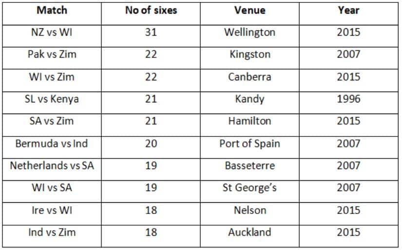 Most sixes hit in a World Cup match* The New Zealand vs West Indies encounter in 2015 World Cup was not a good day for the bowlers as 31 sixes were pummeled, which is nine more than the Pakistan vs Zimbabwe match in 2007 which is second on the list of most sixes hit in a World Cup match with 22 maximums.