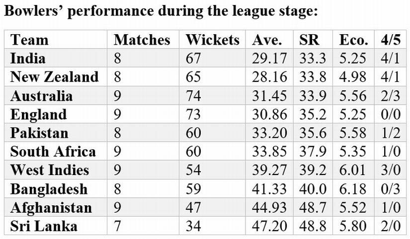 Indian bowlers aced the bowling chart during the league stage of this World Cup as their bowlers’ strike-rate of 33.3 is the best among all the teams. Moreover, the top-four teams in this char are all playing in the semi-finals.