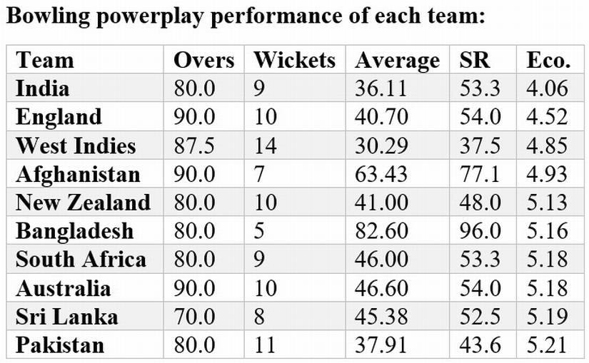 Indian bowlers’ once again topped the chart in the bowling Powerplay in terms of economy rate while West Indies bowlers took the most number of wickets in bowling Powerplay during the league stage.
