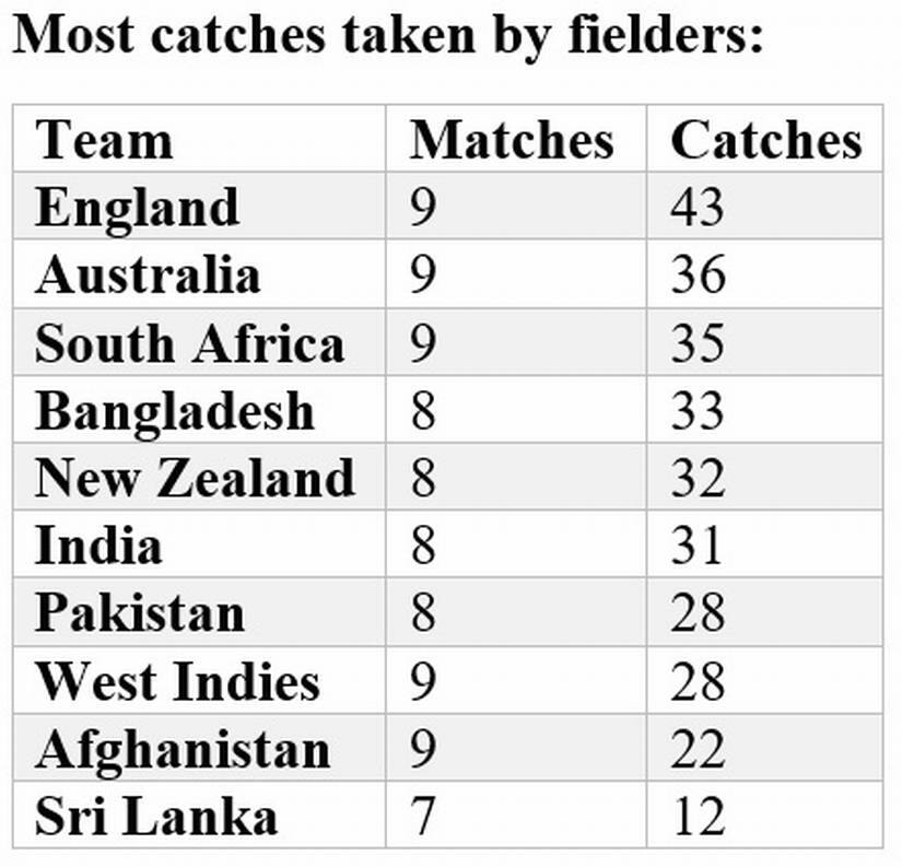 England took the most number of catches in the tournament while India dropped only four catches in the tournament – the least among all the teams.