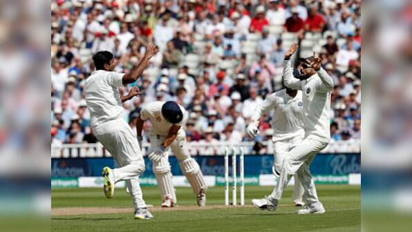 Birmingham: Off-spinner Ravichandran Ashwin produced one of his impactful performances outside the sub-continent as India reduced England to 285 for nine on the opening day of the first cricket Test, on Wednesday. Ashwin (4/60) registered his best figures in Test cricket across South Africa, England and Australia as the hosts lost six wickets for 69 runs in the final session of play to find themselves in a precarious position after opting to bat. [caption id=“attachment_4872281” align=“alignleft” width=“380”] Ravichandran Ashwin celebrates taking Alastair Cook’s wicket on day one of the first Test match. AFP/Adrian Dennis[/caption] Joe Root (80 runs off 156 balls, 9x4s) scored an unbeaten 41st Test half-century, but the English innings completely got derailed after his dismissal. At stumps, Sam Curran was batting on 24 with James Anderson for company. In the final session of the day, India didn’t begin well with England progressing as Jonny Bairstow (70 off 88 balls, 9x4s) brought up his 18th Test half-century off 72 balls. In doing so, he put on 105 runs with Root for the fourth wicket. Root and Bairstow got their runs off only 138 balls as England crossed 200 in the 62nd over and were looking set for a strong total before things unravelled in the oddest fashion. It was the 63rd over of the innings when Virat Kohli’s direct throw ran out Root as he tried to come back for non-existent double. That dismissal changed the momentum of the innings with England collapsing thereafter. England lost three wickets for eight runs in the next 25 balls. First, Bairstow played on off Umesh Yadav (1/56) and then Ashwin trapped Jos Buttler lbw for a two-ball duck as England were rocked out of their comfort zone. Sensing a kill, India never let go of the pressure in the remainder of the session. Every time England tried to build a partnership, Indian bowlers struck back and it resulted in regular wickets. Ashwin dismissed Ben Stokes (21) with a return catch in the 75th over as England were reduced to 243 for seven. A 35-run partnership between Adil Rashid (13) and Curran raised visions of a fightback but Ishant Sharma (1/46) finally got a return for his hard toil, trapping Rashid lbw with a sharp inswinger. Ashwin then accounted for Stuart Broad (1), lbw too, but Anderson somehow managed to thwart his efforts for a five-wicket haul. Earlier, Mohammed Shami struck twice in the second session before England skipper Root scored his 41st Test half-century to guide the hosts to 163 for three at tea. Shami bowled an incisive spell after lunch, dismissing Keaton Jennings (42) and Dawid Malan (8) as India piled on the pressure in the second session. Jennings was the first to go but in an odd manner. Just prior to his dismissal, there was a pigeon near the pitch that distracted him and in the very next ball, he played on after the ball clipped his pads. It was a lucky breakthrough for India as their pacers found movement after the break. Ishant and Shami bowled closer to the England batsmen and made them play more often with the latter reaping reward. Ashwin had a loud lbw shout against Malan which was turned down as India lost a review. But Malan never looked comfortable against Shami, who trapped him lbw eventually in the 40th over. The ball was doing just enough, and even DRS didn’t help the batsman. Bairstow though made sure that India didn’t get an upper hand on the proceedings by adopting an attacking approach against Ashwin. Root, meanwhile, dropped anchor and ate up a lot more deliveries against the Indian pacers. His strike-rate dropped below 50, even as he completed his half-century off 107 balls. Root also became the quickest batsman to 6,000 Test runs in terms of time from his debut when he reached the landmark. Root got to the landmark in five years and 231 days of his Test career, surpassing former England captain Alastair Cook’s mark of five years and 339 days. with Root. Opting to bat, England consolidated their position despite losing Cook early, reaching 83 for one at lunch. Ashwin was the only wicket-taker for India in the pre-lunch session, bowling Cook (13) with a ripper in the ninth over. The ball pitched on middle and turned away to knock back Cook’s off-stump.