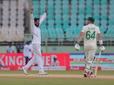 Dean Elgar and Quinton de Kock struck centuries to help South Africa avoid the threat of a follow-on and reach 385-8 at stumps on Day 3 of the first test against India on Friday. Spinner Ravichandran Ashwin took his 27th five-wicket haul in Tests to keep India in control of the series opener, however, with South Africa still trailing by 117 runs. [caption id=“attachment_7453401” align=“alignleft” width=“380”] Ravindra Jadeja (L) dismissed Dean Elgar to claim his 200th Test wicket. AP[/caption] After the Proteas resumed in some trouble on 39-3, Elgar scored 160 off 287 balls for the opener’s 12th test hundred before De Kock attacked India’s spinner to make 111 off 163 deliveries. They put on 164 runs for the sixth wicket, allowing South Africa to ease past the follow-on mark. At stumps, Senuran Muthusamy (12 not out) and Keshav Maharaj (3 not out) were in the middle. Responding to India’s first innings of 502-7 declared, South Africa, at one stage, were reeling on 34-3 dominated the third day of the test and lost only two wickets in the first two sessions. # Ravindra Jadeja became the fastest left-arm bowler to take 200 Test wickets – in just 44 matches – going past Rangana Herath who achieved the feat in 47 matches. He is also the second fastest Indian to achieve the feat behind R Ashwin (37 matches). # Quinton de Kock became the second South African wicket-keeper to score a ton in Asia in Tests after AB de Villiers who scored a ton against Pakistan at Dubai in 2013. # Dean Elgar’s 160 runs in the first innings is the fifth highest individual score for South Africa in India in Tests. The highest is 253* by Hashim Amla – at Nagpur in 2010. # Ravichandran Ashwin has now taken five five-fors against South Africa in Tests – the most by any bowler, going past Harbhajan Singh (4) and Javagal Srinath (4). # This was the third time ever that South Africa managed to add two century stands in India in a Test innings – fifth and sixth wicket. The other two instances recorded in 2000 in Bangalore (Innings 2) and in Nagpur in 2010 (Innings 1). # The last time when India conceded 350-plus runs in a home Test match in a single day was back in 2009 against Sri Lanka at Mumbai (BS) on the first day of the Test, conceding 366 runs. India conceded 346 runs today – the sixth highest that they conceded in a day’s play at home. With inputs from AP