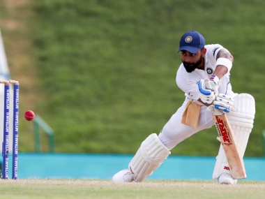Antigua: Ajinkya Rahane hit back-to-back half-centuries while skipper Virat Kohli too made a well-made fifty as India took control of the first Test against the West Indies. After scoring 81 in the first innings, Rahane remained unbeaten on 53 while Kohli was batting on 51 as India reached 185 for three at stumps on the third day of the match on Saturday. The visitors now enjoy an overall lead of 260 runs with seven wickets in hand and two full days’ play remaining. [caption id=“attachment_7220961” align=“alignleft” width=“380”] Virat Kohli plays a shot en route his fifty on the third day of the first Test against the West Indies. AP[/caption] Dropped on 17 by John Campbell off Kemar Roach’s bowling, Rahane made full use of the life to register his 19th Test fifty. Rahane and Kohli shared an unbeaten 104 runs off 41.4 overs for the fourth wicket to take India to a comfortable position in the match. India lost three wickets after lunch but then Rahane and Kohli joined hands and the duo played without taking any risk to keep the visitors’ nose ahead. Off-spinner Roston Chase was the pick of the bowlers for the hosts, picking up two wickets for 69 runs. Opener Mayank Agarwal (16) was the first wicket to fall for India in the second innings, caught LBW by Chase in the 14th over although TV replays showed the ball was missing the leg stump, the batsman didn’t go for a review. After Agarwal’s departure, KL Rahul (38) and Chesteshwar Pujara (25) added 43 runs for the second wicket to take India forward. Rahul, however, gave away his wicket, bowled by Chase. He went across his stumps while going for a sweep, only to expose all the three stumps and the West Indian spinner struck as the batsman failed to connect the ball. An over later, Roach went through Pujara’s defence to reduce India to 81 for three. India had earlier taken a healthy 75 runs first innings lead, which swelled to 89 by lunchtime on the third day. India had bowled out the West Indies for 222 in 74.2 overs in their first innings in reply to 297 with Ishant Sharma returning with best figures of 5 for 43. Besides Ishant, Mohammed Shami (2/48) and left-arm spinner Ravindra Jadeja (2/64) scalped two wickets apiece. For West Indies, Chase top-scored with 48, while skipper Jason Holder played a fighting 39-run knock as the hosts failed to build partnerships. Holder and Miguel Cummins stuck together for 103 balls, forging a crucial 41-run partnership for the ninth wicket to take West Indies close to the Indian total. Holder kept a calm head and guided his younger partner Cummins brilliantly to get as close as possible to the Indian total. While Holder made 39 off 65 balls with the help of five boundaries, Cummins gave his skipper the right support from the other end by just staying at the crease although he couldn’t open his account. Cummins’ determination to stay at the crease saw him play 45 balls for no runs. The Indian bowlers found it difficult to break the stubborn partnership between Holder and Cummins as they needed 85 balls in the opening session of the third day to dislodge the stand. The partnership was finally broken when Holder edged a Mohammed Shami delivery to wicketkeeper Rishabh Pant behind the stumps in the 74th over. Left-arm spinner Jadeja finally drew curtains on the hosts’ innings when he cleaned up Cummins an over later.