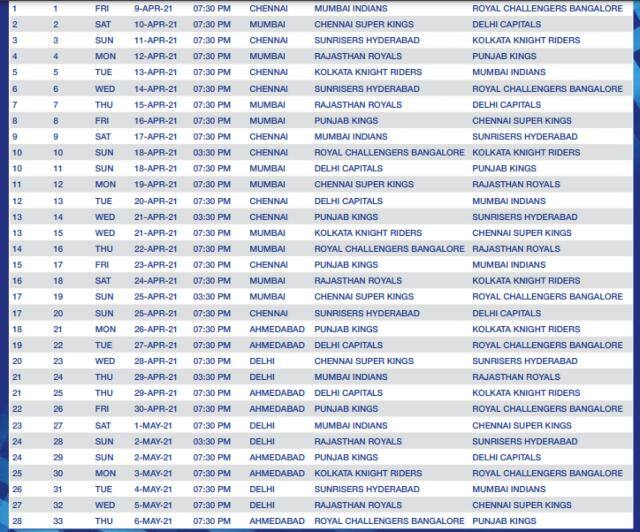 The first match of IPL 2021 will take place in Chennai between defending champions Mumbai Indians and Royal Challengers Bangalore on 9 April.