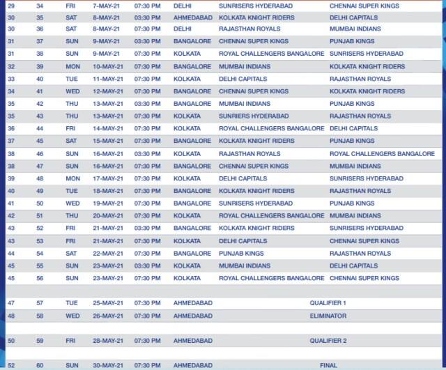 New Delhi: The IPL 2021 will run from 9 April to 30 May across six cities with no team getting to play at home, its Governing Council announced on Sunday. Despite COVID-19 surge, Mumbai has been named as one of the host cities and the tournament will be held behind closed doors at least in in the initial phase of the tournament. The other venues are Ahmedabad, Bengaluru, Chennai, Delhi and Kolkata. The Narendra Modi Stadium in Ahmedabad will host the final on 30 May as well as the playoffs. Defending champions Mumbai Indians will face Royal Challengers Bangalore in the tournament opener in Chennai on 9 April. As on Sunday, the BCCI’s released schedule for the first four weeks till 6 May during which 33 matches will be played and not a single game has been slotted in Kolkata during the phase as there will be eight-phase state assembly elections in Bengal. [caption id=“attachment_9388581” align=“alignnone” width=“640”]  IPL schedule. Screenshot: IPL media[/caption] [caption id=“attachment_9388571” align=“alignnone” width=“640”]  IPL schedule. Screenshot: IPL media[/caption] Each team is set to play at four venues during the league stage. Out of the 56 league matches, Chennai, Mumbai, Kolkata and Bengaluru will host 10 matches each while Ahmedabad and Delhi will host eight matches each. “One of the highlights of this edition of the VIVO IPL will be the fact that all matches will be played at neutral venues, no team will play at their home venue. All teams will play at 4 out of 6 venues during the league stage,” read an IPL statement. There will be a total of 11 double headers where six teams will play three afternoon matches and two teams will play two afternoon matches. The afternoon games are slated for a 3.30 pm start while the evening games will have a 7.30 pm start. “The fixtures of the tournament have been mapped in a way that every team will travel only three times during the league stage, thus reducing commute and minimising risk. “The VIVO IPL this year at home will be played behind closed doors to begin with and a call on allowing spectators will be taken at a later stage of the tournament,” the statement read further. The previous edition was played in the UAE amid the pandemic but since then the COVID-19 situation has improved drastically in India. Click here to check the entire schedule. With inputs from PTI