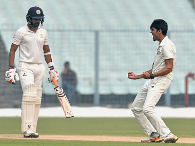 Vidarbha bowler RN Gurbani reacts after dismissing Karnataka batsman Vinay Kumar during the 2nd semi-finals of Ranji Trophy. PTI[/caption] After overnight batters, skipper R Vinay Kumar (36) and Shreyas Gopal (24 not out) joined hands for a gritty 37-run partnership for the eighth wicket, Abhimanyu Mithun (33) associated with Gopal to put on 48 runs for the ninth wicket and take Karnataka closer to the target. But Gurbani, who picked up all three wickets to fall on the final day, broke the stand by accounting for Mithun. The pacer returned to finish off the tie by dismissing last man Sreenath Aravind (2) in his next over to trigger wild celebrations in the Vidarbha camp. Gurbani, who returned figures of 7/68 and a match haul of 12/162, was declared man of the match. The 24-year-old, in superb form, having taken five-wicket hauls in his last three outings, had figures of 5/94 in the first innings. In the first innings, Vidarbha chose to bat and were skittled out for 185. Karnataka, in reply, rode on Karun Nair’s brilliant 153 to amass 301. On the fifth day, Karnataka depended on Vinay Kumar and Gopal to guide the team home. Vinay Kumar took on the aggressor’s role and hit three boundaries before being too ambitious and attempting a cut off Gurbani in the final delivery of the 50th over only to get an edge which carried comfortably to wicketkeeper Akshay Wadkar with Karnataka still 57 runs shy of the target. Mithun then continued from where Vinay Kumar had left, smashing the ball around while Gopal held one end up. Mithun hit the disappointing Umesh Yadav (1/61) for two consecutive fours in one over raising hopes of their win and deflating the opposition’s confidence. Mithun hit five fours before getting out by trying one shot too many and falling to Gurbani with Aditya Sarvate holding the catch at deep point. Aravind became Gurbani’s third victim of the morning and seventh of the innings as Karnataka fell inches short. Gurbani’s two wickets in the space of 10 balls snatched the victory for Vidarbha. Brief scores: Vidarbha: 185 and 313 vs Karnataka: 301 and 192 all out in 59.1 overs (R. Vinay Kumar 36, Abhimanyu Mithun 33, Karun Nair 30; Rajneesh Gurbani 7/68).