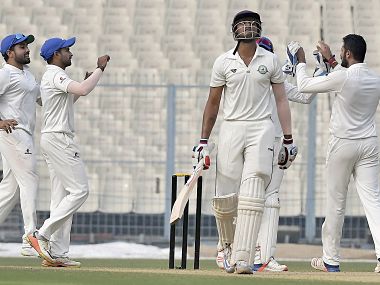 Kolkata: Ganesh Satish’s unbeaten half-century and a brisk 49 from Apoorv Wankhede helped Vidarbha wipe out the first innings deficit and go ahead by 79 runs in their Ranji Trophy semi-final against Karnataka on Tuesday. The third day’s play ended with Vidarbha reaching 195 for four. At stumps, Satish was going strong on 71 while Akshay Wadkar was batting on 19. [caption id=“attachment_4266895” align=“alignleft” width=“380”] Karnataka bowler Sreenath Aravind (R) congratulates his teammates after the fall of Vidarbha wicket. PTI[/caption] Sreenath Aravind was the pick of the Karnataka bowlers, claiming two wickets. The 83-run partnership for the fourth wicket between Satish and Wankhade ensured Vidarbha get some runs to defend. After losing in-form opener Faiz Fazal, the second highest run-getter in Ranji trophy this season, for a duck, their innings was somewhat steadied by the experienced Wasim Jaffer (33). Aravind was hitting the deck hard with his in-dippers, and they were troubling the batsmen a lot. The pressure finally paid off with the wicket of Jaffer. Aravind got the most important wicket of Jaffer, who was looking set for a big one, and the batsman was clearly unhappy with the umpire’s lbw decision. Just before tea, Vidarbha were dealt a body blow when Wankhede holed out at mid wicket, driving a Aravind delivery straight to Vinay Kumar. The score at tea was 174 for four for a lead of 58. Earlier in the day, Karnataka were all out for 301 to take a vital first-innings lead of 116 runs. Overnight batsmen Karun Nair and R Vinay Kumar could add only seven runs to the total. Karun was dismissed after playing a superb knock of 153. Rajneesh Gurbani picked up five wickets while India pacer Umesh Yadav claimed four. Brief scores: Vidarbha: 185 and 195/4 in 47 overs (Ganesh Satish 71) Karnataka 1st innings 301 all out in 100.5 overs (Karun Nair 153; Rajneesh Gurbani 5/94, Umesh Yadav 4/73).