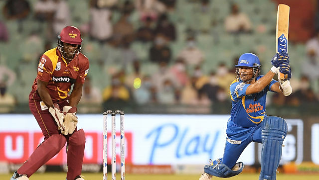 Raipur: Sachin Tendulkar-led India Legends defeated West Indies Legends by 13 runs to storm into the summit clash of the Road Safety World Series T20. Tendulkar (65) led the way with a half century after Virender Sehwag’s entertaining cameo and Yuvraj Singh’s six-hitting spree to post 218 for three in last night’s semi-final clash. Chasing 219, West Indies were restricted to 206 for six. Pacer R Vinay Kumar took two West Indian wickets – captain Brian Lara (46) and Tino Best – at a crucial juncture in the 18th over that brought India back into the game. Dwayne Smith’s 63 (36b, 9x4s, 2x6s) and Narsingh Deonarine’s 59 (44b, 5x4s, 2x6s) went in vain as West Indies could not repeat their performance against the England Legends and bowed out. [caption id=“attachment_9433021” align=“alignnone” width=“640”]  India Legends opener Sachin Tendulkar in action during their match against West Indies Legend. Image Courtesy: RSWS[/caption] Earlier put into bat, Indian Legends posted 200 plus target in their second successive game. Besides Tendulkar, Yuvraj played an unbeaten 20-ball 49 whirlwind knock, laced with six sixes and a four, to take India Legends past 200. Sehwag (35, 17b, 5x4s, 1x6), Yusuf Pathan (37) and Mohammed Kaif (27) too contributed with the bat for the hosts. Yuvraj slammed six sixes in the last two overs. The 19th over saw Yuvraj hit leggie Mahendra Nagamootoo for four hits over the rope while the next two came in the last over of Suleiman Benn. Brief scores: India Legends 218 for 3 (Sachin Tendulkar 65, Yuvraj Singh 49*; Tino Best 2/25) beat West Indies Legends 206/6 (Dwayne Smith 63, Narsingh Donarine 59*; R Vinay Kumar 2/26) by 12 runs.