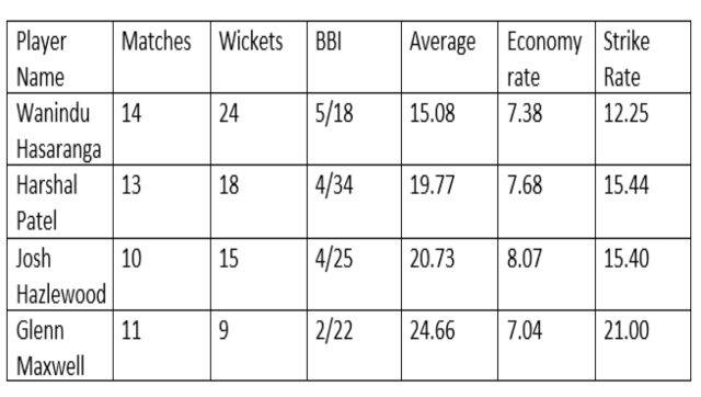 In the bowling department, Wanindu Hasaranga and Harshal Patel are doing the heavy lifting and Josh Hazlewood has provided the extra edge in the powerplay overs. Maxwell too has made some useful contributions with the ball and the only disappointment in the RCB bowling department this year has been Mohammad Siraj, who was dropped from the XI for the team’s last fixture. Here’s a look at the team’s top bowlers: