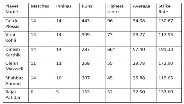 The Royal Challengers Bangalore made some major changes to their line up ahead of the IPL 2022. The captaincy was handed over to Faf du Plessis as Virat Kohli stepped down from the post after the conclusion of the campaign last year. The management retained Glenn Maxwell and also made a very crucial addition of Dinesh Karthik to address their middle-order woes. The experienced stumper returned to the side and has been in a purple patch off late. With the bat, Karthik has been the crisis man for the RCB unit and has provided much needed momentum in the final overs of the innings on numerous occasions.  Royal Challengers Bangalore all-rounder Wanindu Hasaranga celebrates the fall of a Punjab Kings wicket. Sportzpics Skipper Faf hasn’t been at his consistent best but has scored useful and crucial runs for the side in the league stages, and Kohli’s return to form is much needed relief for the RCB think-tank ahead of the big-ticket fixtures. Rajat Patidar and Shahbaz Ahmed have made decent contributions to the tally too, and Maxwell continues to do what he does best - score runs at a brisk pace. Here’s a look at the team’s top batsmen: