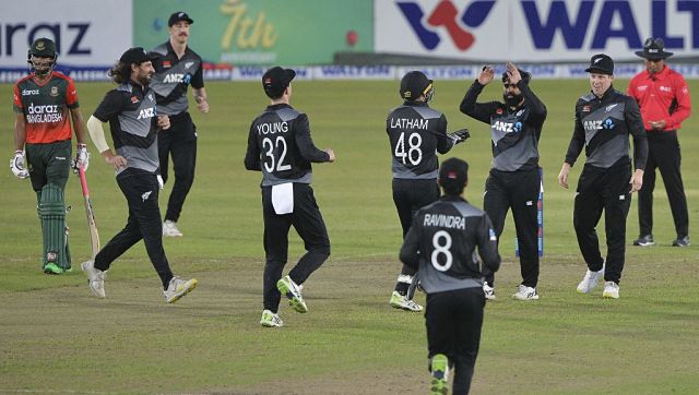 Dhaka: Skipper Tom Latham and Finn Allen hit attacking knocks to set up a 27-run consolation win for New Zealand in the fifth T20I against Bangladesh on Friday. Latham’s unbeaten 50 and a 24-ball 41 by Allen guided New Zealand to 161 for five after electing to bat first in Dhaka. The Kiwi bowlers kept down Bangladesh to 134-8 in 20 overs but the hosts took the five-match series 3-2. Left-arm spinner Ajaz Patel and pace bowler Scott Kuggeleijn took two wickets each as Bangladesh faltered in their chase despite an unbeaten 49 by Afif Hossain. [caption id=“attachment_9954461” align=“alignnone” width=“640”] New Zealand’s Ajaz Patel (third from right) celebrates with teammates after the dismissal of Bangladesh’s wicket-keeper Mushfiqur Rahim. AFP[/caption] “Great to finish this leg of the tour on a high,” Latham, who was named man of the match, said after the win. “The way we were able to piece it all together was (pleasing). We put up close to a perfect performance, took all the learnings from the previous games.” Latham, a left-handed wicketkeeper-batsman, stood out with his second half-century of the series after Allen’s blitz to take the attack to the opposition bowlers. Bangladesh were in trouble at 46-4 before Hossain and skipper Mahmudullah Riyad put on 63 runs for the fifth wicket to raise Bangladesh’s hopes of chasing down their target of 162. Kuggeleijn broke the stand with Mahmudullah’s wicket and Patel trapped Nurul Hasan lbw for four to flatten the Bangladesh batting. Kuggeleijn finished with 2-23 while Patel returned figures of 2-21 from his four overs. “Would’ve liked to win today but I think New Zealand batted really well, we didn’t chase well but happy to win the series,” Mahmudullah said in praise of the opposition. Bangladesh came into the game knowing the series was already in the bag thanks their six-wicket in the fourth match on Wednesday. Allen and Rachin Ravindra took the advantage, forging a 58-run in the opening stand before Bangladesh had some success with the ball. Allen was particularly aggressive, hitting four fours and three sixes. Shoriful Islam, who bore the brunt of the onslaught, removed Ravindra for 17 to earn Bangladesh their first breakthrough. Allen was given leg-before out next ball but the decision had to be overturned on review as replay indicated that the ball pitched outside leg-stump. Shoriful, however, had the last laugh as he bowled Allen in the next ball to stem New Zealand’s run flow. Latham put New Zealand back in control with his sublime batting and was ably assisted by Henry Nicholls (20) and Cole McConchie (17 not out). Shoriful finished with highest 2-48 for Bangladesh. Left-arm spinner Nasum Ahmed was named player of the series for his eight wickets alongside Latham, who topped the batting chart with 159 runs.