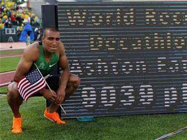 Ashton Eaton set a glittering decathlon world record at the U.S. Olympic trials on Saturday, riding the cheers of a thrilled home crowd to upstage a stellar cast of athletes. The 24-year-old’s total of 9,039 points in wet and cold conditions bettered the 2001 mark of Czech great Roman Sebrle by 13 points and capped an extraordinary meeting for the American, who had already set decathlon records for the 100 metres and long jump legs on Friday. “It’s like living an entire lifetime in two days,” Eaton told reporters after capturing the record on his own training track in Eugene, Oregon. “To do the best that I possibly could in my world makes me pretty happy. “I really, really would never pick another event. The decathlon is the best.” [caption id=“attachment_355323” align=“alignleft” width=“380” caption=“U.S. decathlete Ashton Eaton poses beside the scoreboard after setting a new world record in the men’s decathlon at the U.S. Olympic athletics trials in Eugene. Reuters”]