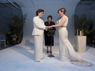 New York: Christine Quinn, New York’s highest-ranking openly gay official and the leading candidate to be the city’s next mayor, married her longtime girlfriend on Saturday, walking down the aisle to Beyonce’s “Ave Maria.” The wedding came less than a year after New York Democratic Governor Andrew Cuomo signed a law legalising same-sex marriage in the state, whose first same-sex nuptials were held 24 July. Quinn, the speaker of the New York City Council and a vocal advocate of same-sex marriage, wore a full-length, cream-colored gown designed by Carolina Herrera and a hair comb fashioned with family heirlooms. [caption id=“attachment_315155” align=“alignleft” width=“380” caption=“New York City council speaker Christine Quinn (right) married her longtime partner Kim Catullo on Saturday in a private ceremony. AP”]  [/caption] Quinn’s wife, New York lawyer Kim Catullo, wore a cream silk evening suit designed by Ralph Lauren. Catullo, who like Quinn is 45, walked in to Bruce Springsteen’s “If I Should Fall Behind.” Cuomo, New York Mayor Michael Bloomberg and Police Commissioner Ray Kelly were among the 275 guests. Before the reception, several politicians expressed hopes that same-sex marriage will be legalized across the country. “It’s not a question of if but when - everywhere,” US Senator from New York Charles Schumer said. State Senator Tom Duane, a lead sponsor of New York’s same-sex marriage bill, posed for cameras planting a kiss on his boyfriend of two decades. “We’re going to dance up a storm,” he said. New York is among eight states and the District of Columbia that either allow gay marriage or are awaiting enactment of legislation to legalize same-sex nuptials, while a handful of other states have civil unions or domestic partnership laws on their books. Where same-sex marriage is legal, it has been due to court rulings and legislative action, since popular votes have consistently backed bans. Still, public opinion appears to be shifting. A Gallup Poll survey this month found that half of Americans believe same-sex couples should have the same right to wed as heterosexuals do, slightly down from a year ago. Other recent surveys have also found the country is split over whether to extend marriage rights to same-sex couples, with younger and less religious people tending to be more supportive of gay marriage. Reuters