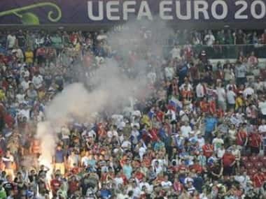 The Russian FA has been fined 35,000 euros ($43,900) after fans set off and threw fireworks and displayed illicit banners during their team’s final group match against Greece at the National Stadium on June 16, UEFA said on Saturday. The Russian FA was fined 30,000 euros for similar incidents as well as for a supporter entering the pitch when Russia played co-hosts Poland on June 12, an occasion marred by fighting amongst supporters before and after the match in Warsaw. [caption id=“attachment_355100” align=“alignleft” width=“380” caption=“The Russians were also fined 120,000 euros when about 30 fans attacked stewards in Wroclaw. Reuters”]