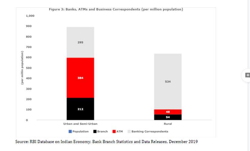 Fourth, there is a distinct urban bias across the banking infrastructure. In urban areas, there are more bank branches and ATMs (596 per million population) than in rural (102). To compensate in the last decade, more business or banking correspondents (BCs) who undertake transactions with POS (point of sale) machines, have been hired in rural India (534 per million population) than in urban areas (295). But post-COVID19, their operations, which depend on Aadhaar biometric authentication, could spread infection.