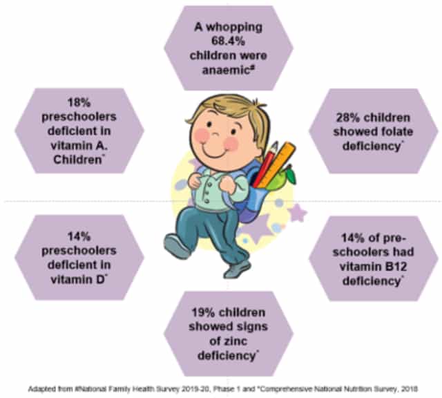 Yesterday I had a worried parent approach me with her five-year-old kid. Her grouse was that her kid had frequent cough and cold because of which, he would miss his classes a lot. I simply asked the mother one question, ‘Does your child eat his vegetables and fruits?’ The kid would only eat rice and ghee, skipping everything else. This is not a one-off case, most of the toddlers and pre-schoolers I consult hate to eat veggies and would only fill up on carbs. But in reality, their growing body is still hungry for nutrients. Indian children falling short on vitamins and minerals Unfortunately, Indian pre-schoolers are found to be deficient in many micronutrients, most prominently iron, zinc, folate and vitamin A. This is particularly concerning because toddlers and pre-schoolers require 2.5 times more iron, 4 times more calcium and 2 times more energy when compared to an adult. The varied functions of micronutrients could explain their high needs. Iron is required for physical and mental development. Even a mild deficiency can impair brain development. Iodine is also a nutrient with capabilities to prevent learning disabilities and delayed development in children. Zinc and vitamin A are required for better immune function and for good vision.
