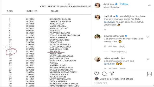 Tina took to her Instagram and congratulated her younger sister. She wrote, “I am delighter to share that my younger sister Ria Dabi got rank 15 in UPSC 2020 exam." [caption id=“attachment_9996691” align=“alignnone” width=“300”]  A screenshot of the announcement on Instagram./@dabi_tina[/caption] Ria is graduate from Lady Sri Ram College and was a student of Delhi University, just like her elder sister. Apart from academia she dabbles in painting as well. Her sister, IAS Tina Dabi is currently posted in the Rajasthan cadre as the Joint Secretary Finance (Tax).