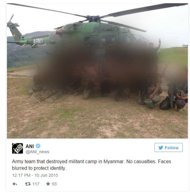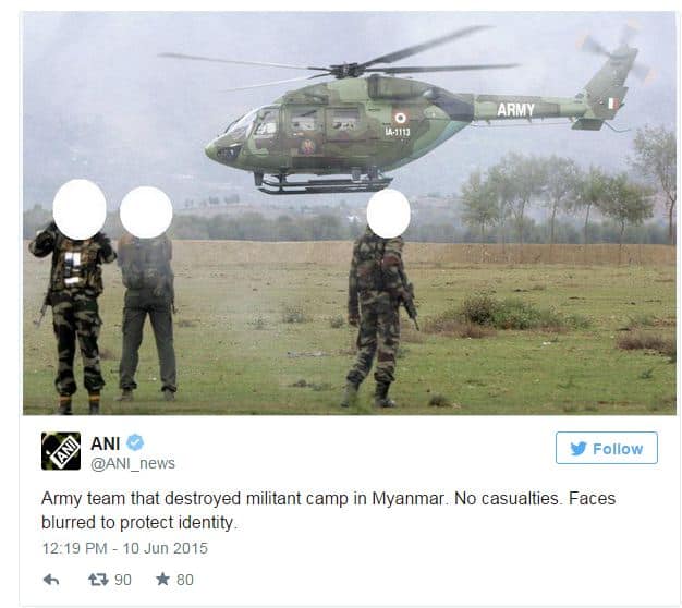 An integral part of publishing a news story is the photo along with the report. A day after the Indian Army attacked northeastern insurgents in Myanmar, media houses were busy hunting for a photo of the Indian Army bravehearts who avenged the death of 18 security personnel who were killed in an 4 June ambush by the UNLFW militants in Manipur’s Chander district. That’s when we found it. A photo of bunch of Indian Army commandos in front of a chopper looking happy and victorious. Almost every media house (including us) picked up the photo, captioned it, saying ’these soldiers had carried out the offensive against a group of militants,’ and published it. A day later spokesperson of the Ministry of Defence Sitanshu Kar released a clarification and tweeted: