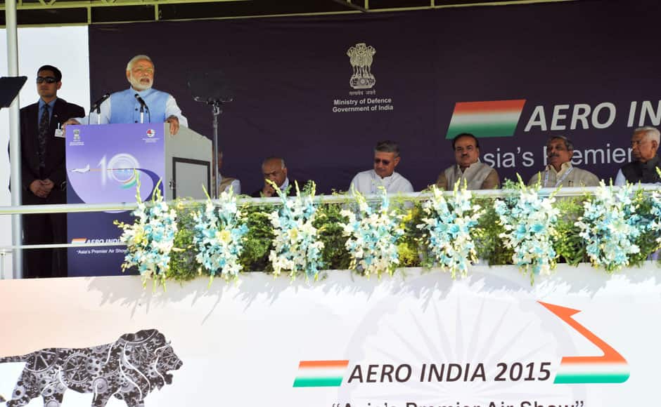 [caption id=“attachment_2105513” align=“aligncenter” width=“940”]  Prime Minister Narendra Modi watching the Aero India Show 2015, in Bengaluru on Wednesday. PM Modi inaugurated the show and said India needs to increase its defence preparedness and modernise its forces. PIB[/caption] [caption id=“attachment_2105517” align=“aligncenter” width=“940”]  PM Modi said the government’s focus is to reduce imports and develop domestic defence industry with a sense of mission which it “is at the heart of our Make in India programme”. Also seen in this photo are Union Minister for Defence Manohar Parrikar and Union Minister for Chemicals and Fertilizers Ananth Kumar. PIB[/caption] [caption id=“attachment_2105519” align=“aligncenter” width=“940”]  Addressing thousands during the inauguration, the Prime Minister also spoke about involving country’s scientists soldiers, academia, industry and independent experts more closely in research and development.. PIB[/caption] [caption id=“attachment_2105523” align=“aligncenter” width=“940”]  Flanked by Defence Minister Manohar Parrikar and Karnataka Governor Vajubhai Rudabhai , PM Narendra Modi watches the Aero India show. PIB[/caption] [caption id=“attachment_2105525” align=“aligncenter” width=“940”]  Addressing the gathering, PM Modi said as a nation of one billion people India also has a huge requirement for managing internal security. PIB[/caption]