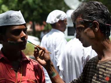 New Delhi: Its 1pm. Chiranjeev Kumar has called it a day. He leaves behind Anna Hazare, Baba Ramdev and a crowd of around 4000 gathered at Delhi’s Jantar Mantar for a one-day protest. “My job is done. I will go home and rest now,” he says, pointing to an empty tray of colors in his hand. Since morning, Kumar has painted tri-colored strips on cheeks of 100 odd people at the fast venue. He charges Rs 5 per cheek. One single color tray costs Rs 100 and paints 50 cheeks. Kumar’s profit for today is Rs 800. Most of Anna’s one day fasts have been on weekends. That is when Kumar leaves his Janakpuri home for Anna ki sabha as he calls it. [caption id=“attachment_330601” align=“alignleft” width=“380” caption=“Chiranjeev Kumar paints the tri-colour on the face of an Anna supporter. Naresh Sharma/Firstpost”]  [/caption] “My coming here solves two purposes. I listen to Anna and makes money too,” says Kumar, who claims to have attended and got business from all Anna fasts in the national capital. “The day Anna was released from Tihar jail was the biggest in terms of money I made. Every one became Indian that day,” says the native of Bihar’s Sitamarhi district. Kumar knows that he is cashing on the emotions of those who come to witness the anti- corruption demonstrations. And he is aware of the market value of the tri-colour. Painting these colours, he says, serves various objectives. “People with such colours on their faces add credibility to the movement. Also, it makes good visuals for media.” Interestingly, he has never painted his face with these colours. “Patriotism lies in one’s heart. These colours don’t make a difference,” he signs off before boarding a bus to his home.