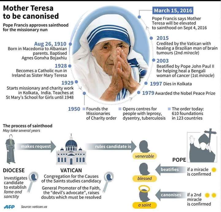 File photo of Mother Teresa. Reuters[/caption] A group of around 40-50 nuns from different parts of the country will be present at the ceremony led by Missionaries of Charity Superior General Sister Mary Prema. Besides Archbishop of Kolkata Thomas D’Souza, about 45 bishops from all over India are now in Vatican. In March, Pope Francis had announced that the Mother, who spent 45 years serving the poor and sick on the streets in Kolkata, will be elevated to sainthood after the Church recognised two miracles attributed to her after her death. To mark the occasion a series of events are being held in the city where the Mother lived and worked all her life. At the Mother House here on Sunday, a special mass will be organised and the nuns have promised to celebrate the occasion with the poorest of the poor. In 2003, Teresa was beatified by then Pope John Paul II in a fast-tracked process which is the first step to gaining Sainthood. In 2002, the Vatican officially recognised a miracle she was said to have carried out after her death, namely the 1998 healing of a Bengali tribal woman, Monika Besra, who was suffering from an abdominal tumour. The traditional canonisation procedure requires at least two miracles. The second miracle was from Brazil, where a person had been healed miraculously as a result of her earlier prayers.
