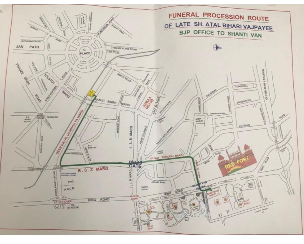 Prime Minister Narendra Modi lays a wreath on the mortal remains of former prime minister Atal Bihari Vajpayee as he pays last respects at BJP headquarters. PTI[/caption] Penning an eulogy to BJP stalwart Atal Bihari Vajpayee, Prime Minister Narendra Modi called him the nation’s ‘moral compass’ and ‘guiding spirit’. “In times of turbulence and disruption, a nation is blessed to have a leader who rises to become its moral compass and guiding spirit, providing vision, cohesion and direction to his people. And, in such a moment at the turn of the century, India found one in Atal Bihari Vajpayee, who was gifted in spirit, heart and mind,” he wrote. The Supreme Court of India and the Registry will observe a half-day holiday on Friday to mark the demise of former prime minister Atal Bihari Vajpayee. Meanwhile, Prime Minister Narendra Modi reached the BJP headquarters in New Delhi ahead of the convoy carrying Vajpayee’s mortal remains’ arrival. Former prime minister Atal Bihari Vajpayee’s mortal remains are being moved in a flower-decorated truck to the BJP headquarters at Deendayal Upadhyay Marg in New Delhi. They will remain there till 1 pm, after which the final funeral procession to the cremation ground on the banks of river Yamuna will take place. Over five lakh people are expected to attend late prime minister Atal Bihari Vajpayee’s funeral on Friday, including VVIPs, politicians and dignitaries at the BJP headquarters and the Rashtriya Smriti Sthal. On Friday morning, hundreds of people gathered outside Atal Bihari Vajpayee’s New Delhi residence to pay their last respects to the former prime minister. His body has been kept at his home for public viewing from 7.30 am to 8.30 am. Atal Bihari Vajpayee’s former private secretary Shakti Sinha wrote in the Hindustan Times about his experience working with the late prime minister closely. “Vajpayee was an uncompromising patriot, with a strong sense of his Hinduness, which was cultural and civilisational. That meant that the primary loyalty citizens was to the country.” Central Delhi has been placed under heavy security due to Atal Bihari Vajpayee’s funeral procession that will take place on Friday. More than 20,000 security personnel have been deployed and Independence Day security arrangement has been extended as well. Veteran leader Atal Bihari Vajpayee’s body has been kept at his official residence: 6A Krishna Menon Marg. People can pay homage to the late prime minister at his home between 7.30 am and 8.30 am on Friday. The funeral procession for former prime minister Atal Bihari Vajpayee will leave the BJP headquarters at 1 pm and the last rites performed at the Rashtriya Smriti Sthal at 4 pm on Friday. The Smriti Sthal is a common memorial site, located between Jawaharlal Nehru’s memorial ‘Shanti Van’ and Lal Bahadur Shahstri’s ‘Vijay Ghat’. Vajpayee’s last rites will be performed on a raised platform, surrounded by greenery. Keeping in mind the final procession of former prime minister Atal Bihari Vajpayee on Friday, the Delhi Police has issued a traffic advisory for the National Capital. Almost all roads leading to central Delhi including Krishna Memon Marg, Akbar Road, Janpath and India Gate C-Hexagon, among others, will remain closed from 8 am onwards for the general public today in order to ensure smooth vehicular movement during Vajpayee’s final journey. Leaving boundaries of their respective parties, political leaders on Thursday bid an emotional goodbye to former prime minister Atal Bihari Vajpayee describing him as a visionary statesman with acceptability across a diverse ideological spectrum, a gentle giant and a consensus seeker. Vajpayee, who was 93, died at AIIMS on Thursday evening after a prolonged illness. Several leaders saw a personal loss in death of Vajpayee, one of India’s most respected leaders who led the nation through several crises and held together a tenuous coalition with his inclusive politics. Prime Minister Narendra Modi described Vajpayee as a “father figure” who taught him valuable aspects about Sangathan (organisation) and Shaasan (administration).” In a brief televised address, Modi said Vajpayee used to hug him with affection whenever they met. Veteran BJP leader LK Advani, who along with Vajpayee was a central figure in the party for much of its existence, described the former prime minister as one of the country’s tallest statesmen and his closest friend for over 65 years whom he will miss immensely. [caption id=“attachment_4982011” align=“alignright” width=“380”]