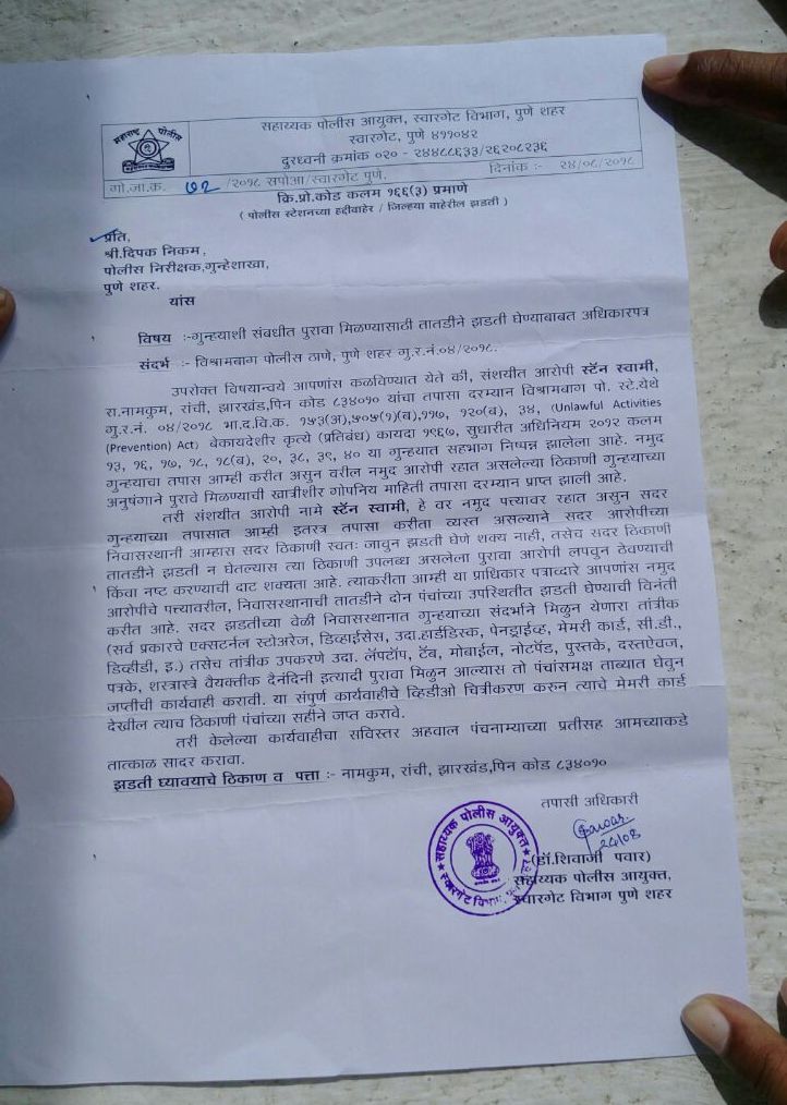 Raids LIVE updates: Sudha Bharadwaj’s daughter said the raid team of ten people which conducted the search did not have search warrants, although it had other documents. CPM leader Prakash Karat criticised the raids conducted across the country on Tuesday. “This is a brazen attack on democratic rights. We are demanding that all the cases against these people be withdrawn and they be released forthwith,” he said. A Habeus Corpus petition has been filed in Delhi High Court against the arrest of journalist Gautam Navlakha. He was picked up from his Delhi home on Tuesday afternoon. The Delhi High Court will hear the petition at 4 pm. “This is another example of government selectively targeting Christians in the name of Pathalgadi and Maoist connections. Case number 4/18 registered by Vishrambaug police station in Pune is an attempt to link Father Swamy with urban Maoists groups, which is wrong.” said Vasvi Kido, a social worker. Human rights activist and lawyer Sudha Bharadwaj was arrested from her Delhi residence on Tuesday. The police had earlier raided her Badarpur residence and confiscated her laptop, journal, storage devices and mobile phones. The police reportedly also requested access to her email IDs and social media accounts. Writer and activist Varavara Rao has been arrested in Hyderabad and is being taken to the Nampally court to obtain transit warrant. Father Stan Swamy from Ranchi said that the Pune police raided his residence at 6 am on Tuesday and took his laptop, mobile phone, his tab, a few documents, 20-25 videotapes and a press release on the Pathalgadi (movement) released a few weeks ago. Pune police said that they had received confidential information about Swamy and so wanted to seize his laptop, hard drives, mobiles, notebooks and other technical equipment to prevent him from destroying information. Teams of Pune police raided the houses of activists in Mumbai, Ranchi, Hyderabad and Faridabad. Among those whose houses were searched are Vernon Gonsalves and Arun Ferreira in Mumbai, Sudha Bharadwaj in Faridabad and Stan Swamy in Ranchi. In Hyderabad, raids were reported from the homes of Varavara Rao and his family members, and two other activists, Kranti and Naseem. Taking the investigation in the Bhima Koregaon incident forward, the police teams are conducting nationwide raids. A team of Maharashtra Police raided the home of noted social worker, Father Stan Swamy in Namkum area of Ranchi in Jharkhand around 6 am on Tuesday morning. Police have confiscated several items like computers, laptop, CDs, papers and books during their search. Swamy was also quizzed about activities of several banned organisations in Maharasthtra. Jharkhand police are aiding the operations.