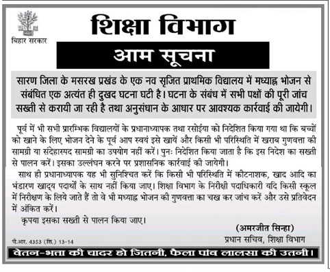 10. 00 am: Bihar issues ad, wants principal to taste meals before feeding children The Bihar education department has issued an advertisement in prominent newspapers today reiterating that the school principal and the cook should taste the food prepared under the midday meal scheme before serving it to children. The advertisement also states that insecticides and food ingredients should not be stored together as it could contaminate the food.
