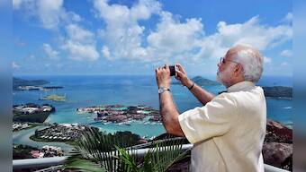 Prime Minister Narendra Modi takes in the beauty of Mahe and clicks a picture during the dedication of the India - Seychelles cooperation project 'Coastal Surveillance Radar System' in Mahe, Seychelles on Wednesday. PTI