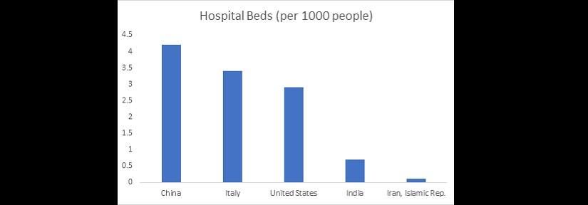 This is part 2 of an explainer on the coronavirus pandemic. In part 1, where did it come from? How does it spread? Who and how does it kill? What might stop it? *** What are the implications of this on policy? Pray for summer, obviously. But, what else? Any policy has to be mindful of the virus, and of the capacity of the country. Let us compare the treatment capability of different countries affected with India’s. This is data from the WHO, accessed through the World Bank.