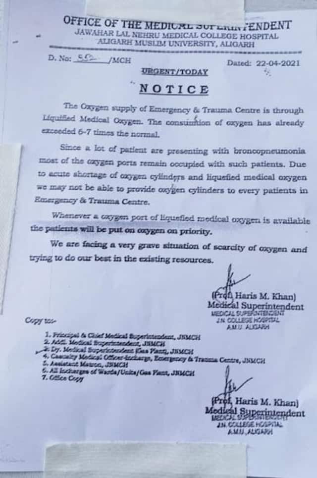 The second wave of COVID-19 pandemic has created new levels of panic and anxiety but as Albert Camus says, “Panic suggests a response to dangerous but short term condition from which we can eventually find safety but there can never be safety and that is why we need to love our damned fellow humans and work without hope or despair for the amelioration of suffering. Life is a hospice, never a hospital.” Recently when Aligarh Muslim University saw its most fertile minds – a dozen of faculty members – depart one after another within a span of two days, the fear in Aligarh rose to its peak with rapid loss of lives and rising number of affected people. Professor Aftab Alam of the department of Political Science, AMU says that in his entire career and during all his days in Aligarh he has never witnessed such a huge loss in such a short duration. He says that every sound of message-notification on his phone makes him apprehensive as he checks his phone with a wary look on his face and with a fear of getting another bad news. In his own words,“phone ki har awaz par lagta hai koi buri khabar na a jaye.” There is also a problem of media (mis)representation that has heightened the tension. Alam feels when the overall cases were below 1 lakh, media houses were disproportionately projecting the reality and now when the situation is almost out of control, they are not doing the job of showing the correct picture to facilitating the availability of help and resources from different corners. Dr Musavvir Ali, assistant professor of Mathematics at AMU, felt the urge to express his sense of loss and uncertainty through poetry. This urge was felt last by him during the days when the new CAA-NRC rules were being introduced. He says after CAA-NRC, “Dil ka ghubar phir se ab nikla hai. Tab bhi lag raha tha kuch chhoot raha hai aur uske baad ab lag raha hai ki waqt ka koi bharosa nahi, sab chhoot raha hai. The situation is slipping out of hand.” The Office of the Medical Superintendent, Jawaharlal Nehru Medical College Hospital, AMU, has come out with a circular about the scarcity of oxygen in the hospital indicating its helplessness in saving lives and giving timely relief to the patients.