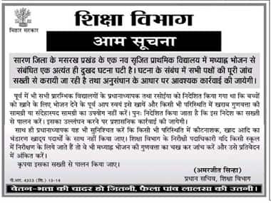 The Bihar education department on Thursday issued an advertisement asking all schools to ensure that the midday meal fed to children is first tasted by the school principal and the cook. “Even when an education department supervisor visits the school during surprise checks, he/she should taste the midday meals,” it said. [caption id=“attachment_965551” align=“alignleft” width=“380”]  The advertisement appeared in leading dailys across Bihar.[/caption] Stating that the government had already issued such guidelines to schools before, the advertisment, issued by Amarjit Sinha, reiterated that the schools should ensure quality meals. It also instructed schools not to store insecticides alongside food ingredients and cattle feed as it could contaminate the food given to children. Bihar Chief Minister Nitish Kumar and Education Minister PK Sahi have been under intense political pressure from the opposition, demanding their resignation after 22 children died in Chabra after eating the midday meal served in their school. In a press briefing on Wesnesday Sahi alleged political conspiracy and blamed the Principal of the school and her husband for the tragedy. Former State cabinet secretary TSR Subramanian said the two ministers should accept moral responsibility and resign. “They should say 22 children have died in my state, I accept moral responsibility and resign.” Bihar Chief Minister Nitish Kumar has also ordered a high level inquiry into the incident and announced compensation of Rs 2 lakh each to the families of the deceased.