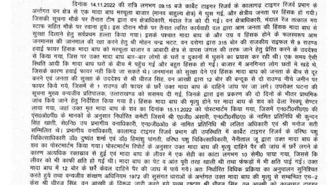 Press release shared by the Corbett Tiger Reserve on the incident.[/caption] And then came the post-mortem examination The post-mortem examination of the tiger’s body was done in the presence of senior forest officials, including one nominated by the National Tiger Conservation Authority, a retired sub-divisional forest officer and a local NGO’s nominated representative. The procedure was conducted by Dr Dushyat Sharma, Senior Veterinary Officer of Corbett Tiger Reserve, and Dr Himanshu Pangati, Senior Veterinary Officer at the Nainital Zoo. According to the post-mortem report, the female tiger died due to blood pressure complications cause by the pellet injury in her right thigh. As importantly, a porcupine quill of about 10 cm length was found embedded in the tiger’s liver, leaving this crucial organ badly damaged. The stomach and intestines of the female tiger were completely empty, and there was an infection in her lungs. The pellets from the 12-bore were found only in the thigh of the right leg which also had an entry wound. The wound in the tigress’s right thigh was sufficient to send her blood pressure haywire, and it’s not rocket science to safely surmise that she was knocking on tiger heaven’s door anyway. The tigress could have been in a semi-conscious daze too, for these animals do not like to stroll through town markets, and neither do man-eaters hunt without stealth or in such places. Tigers are usually poor at catching porcupines, an enduring mystery of our jungles given the agility of these cats and the fact that porcupines need to walk backwards in order to embed their quills into an attacking beast. Leopards are far better at making meals of porcupines which are plentiful in Uttarakhand’s forested landscape. Embedded porcupine quills are often the cause of a tiger turning man-eater because of the chronic injuries they cause and which impair the cat’s ability to hunt regular prey. Jim Corbett, for instance, has related how such embedded quills were the cause of the scourge called the Talla Des man-eating tigress. It is worth noting that one Kamla Devi, a resident of Sankar, was attacked by a tiger on November 8 in Jamaria of Corbett Tiger Reserve Salt Block. She was first referred to Ramnagar and then to Kashipur in critical condition. The woman recuperated and is healthy and back home. After this attack, officials from Sankar to Jamaria located in the Mandal range of Kalagarh Forest Division were on the hunt for a possible man-eater, or a mauler at the least. It is also worth mentioning that it is rare to survive a tiger mauling, much less a deadly attack made with intent to kill and eat. That the woman survived could well be because the offending tiger – or tigress as is likely in this case – had no teeth and blunt claws, classic marks of old age. Harking back to the great Corbett, the first man-eater he killed was the Champawat tigress. This animal, which holds the record for most humans killed by a single animal, was struck by a heavy .500 calibre bullet first from a distance of a few yards. It is a testament to the tremendous vitality of this beast that it lived on and retreated to a ledge. There, Corbett shot at it again with a borrowed, old and out-of-condition shotgun. The tigress gave up the ghost but the slug from the shotgun was found embedded between two foreclaws; Corbett prised it out later. The point is that the tigress was dying of the .500 calibre round that had ripped through her chest, and it was the shock of being fired at again from the shotgun that killed her outright. Corbett has written as much. One of the veterinary doctors associated with the happenings at Marchula made the same point to Firstpost, albeit obliquely. “I was one hour driving time from the spot, and as soon as I received the information, I readied my team and rushed to the rescue. But when we were just about to reach, I received a call from the forest officials that the she died. We could have saved her if we had reached earlier but for how many days is another question," he said. The doctor, who prefers to remain anonymous, said it was “pretty clear after just looking” at the tigress that she was weak and old. “As we began the autopsy, it turned out she had compromised organs, she was going through a pathological condition due to which she was going to die in a few days, however, the 15-20 pellets which hit her in the right thigh caused a synergetic impact on her body leading to an increased blood pressure,” he said. It appears that the forest department did the right thing in trying to drive the animal away with gunshots in the air. The ranger also had the presence of mind to discharge his shotgun, which fires an expanding cloud of pellets, into the ground rather than the air where a stray pellet could have hurt the someone on the rooftops. Tranquilising a tiger isn’t like shooting darts, and it couldn’t have been done at such short notice and in such a tense situation. There doesn’t seem to be intent to kill; the only apparent intent was to defuse the situation and send the tigress back into the woods where it could be dealt with later without any danger to the public. People could have fallen off the rooftops they were crowding (remember Delhi’s ‘Monkey Man’?), and immediate action was imperative. The law and the probe will take its own course. Instead of baying for punishment to the men who did the right thing in very difficult circumstances, one can only hope their actions are recognised for what they were: an attempt to save human lives. From an old tigress that was close to dying anyway. Read all the Latest News