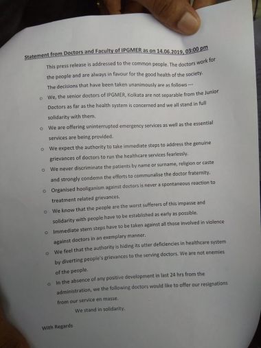 Doctors Strike LIVE Updates: Health Minister Harsh Vardhan has written to West Bengal chief minister Mamata Banerjee on ongoing doctors’ strike in the state. He has asked her to “personally intervene to resolve the current impasse” and take steps to ensure secure working environment for the doctors. Hearing a PIL on doctors’ strike in West Bengal, the Calcutta High Court on Friday gave West Bengal government seven days to respond on issue. The court asked the state what steps were taken by the government to end the impasse. It also said that state will have to put an end to issue and find a solution. Calling for pan-India protest, the Indian Medical Association (IMA) announced a nationwide doctors’ strike on Monday (17 June) to protest the attack on an intern at a Kolkata hospital. According to India Today, the top doctors’ body has said that no essential medical services should be provided on 17 June and that non-violent protests will continue. Reports say that the Calcutta High Court has refused to pass an interim order against the striking doctors. The court has instead asked the state government to hold talks with the doctors and persuade them to return to work. A formal complaint was lodged on Thursday with the West Bengal Medical Council (WBMC) seeking immediate intervention and to take exemplary disciplinary action against the striking doctors as held by the Hon’ble Supreme Court and Calcutta High Court. A new PIL filed by People for Better Treatment (PBT) against the ongoing doctors’ strike will also be heard by the Chief Justice bench at Calcutta High Court today, according to PBT president Dr Kunal Saha. Intensifying the protest, at least 80 doctors at Kolkata’s RG Kar Medical College and Hospital submit mass resignation. They are demanding an unconditional apology of CM Mamata Banerjee for her statement yesterday. After meeting the doctors’ delegation, Union health minister Harsh Vardhan said that he will speak to all state’s chief minister and would also urge Mamata Banerjee to not make it a prestige issue and resolve the crisis at the earliest as the entire nation was suffering because of it. Union Heath Minister Harsh Vardhan condemned the violence against doctors in Kolkata and urged patients and their attendants to exercise restraint. The Minister said he will take up the matter of doctors’ security with all chief ministers and asked the doctors to ensure that essential services to the people are not disrupted Junior doctors in West Bengal continued with their agitation for the fourth day Friday, hampering regular services in all state-run medical colleges and hospitals, and a number of private hospitals. Emergency services were available at only one or two hospitals, including Nil Ratan Sircar (NRS) Medical College and Hospital in Kolkata Resident Doctors of the Institute Of Medical Sciences, BHU Varanasi have showed solidarity toward the attacks on doctors in West Bengal by suspending their services. Junior doctors across West Bengal on Thursday refused to end their stir till they are provided adequate security in government hospitals and defied the deadline set by Chief Minister Mamata Banerjee, who alleged that opposition BJP and Communist Party of India (M) were instigating the protesters as part of a “conspiracy” and giving communal colour to the issue. Services have been affected over the past three days in emergency wards, outpatient facilities and pathological units of many state-run medical colleges and hospitals and a large number of private medical facilities in the state due to the strike by the doctors who are protesting after two of their colleagues were attacked and seriously injured at the NRS Medical College and Hospital here by a mob following the death of a patient. The India Medical Association has declared “All India Protest Day” on Friday, 14 June, against the incident and expressed solidarity with the striking doctors. The opposition attacked Banerjee over the impasse, with the BJP accusing her of acting as “Hitler”. There was high drama as the chief minister reached the state-run SSKM hospital here at around noon amid slogans of “we want justice” by the doctors. “I condemn the agitation. The junior doctors’ strike is a conspiracy by the CPI(M) and the BJP,” Banerjee, who also holds the health and family welfare portfolio, said and directed the police to clear the premises and only allow patients to stay. Stating that patients were suffering, she gave the doctors a four-hour deadline to rejoin service, but later revised it to 2 pm. Warning of strict action against those who do not resume work, she said they will have to vacate hostels. Despite Banerjee’s ultimatum, the agitating doctors continued their stir. A joint platform of doctors met Governor K N Tripathi, who appealed them to resume duties. “We will continue with our agitation till our demands are fulfilled. Our demands are simple, proper security with armed policemen at all hospitals, arrest of culprits involved in the NRS attack on Saturday under non-bailable sections. We did not expect the chief minister to say what she did,” a member of the delegation said. The Trinamool Congress (TMC) chief, however alleged that outsiders had entered medical colleges and hospitals to create disturbance and that she was “abused” by the doctors at the hospital. “The BJP, with help from the CPI(M), is indulging in Hindu-Muslim politics. I am shocked to see their love affair,” Banerjee said and alleged “BJP chief Amit Shah is encouraging his party cadre to create communal tension and run propaganda on Facebook.” The TMC and the BJP are locked in a bitter turf war in West Bengal, which has been rocked by post-poll violence, with Banerjee accusing the saffron party of trying to foment trouble in the state to topple her government. The BJP has claimed that Banerjee is targeting it as she is rattled by its major gains in Lok Sabha elections. In a F