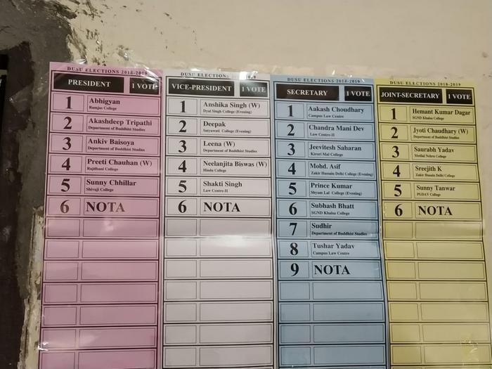 DUSU election 2018 LATEST updates: It was raining pamphlets in Delhi University, and quite litterally. Both, NSUI and ABVP supporters were seen throwing pamphlets in air at the campus, while SUVs full of election material were parked outside the varsity. Deepak Chauhan, a third year BSc student at Ramjas College, says that the violence that erupted during Umar Khalid’s event at his college has led to a disenchantment with DUSU politics. Students are more interested in college elections because there’s a connect with the candidate and the issues are more focused. One of the students said that this year the turnout has been very low. He blamed it on the violence created by ABVP last year in Ramjas College and the scuffle reported on Monday in Zakir Hussain college. The ’nationalist ABVP’ has promised to fight for NSS, NCC and Yoga to be introduced as electives, apart from campaigning for a similar fees structure for the same course across colleges. The party also promises to build a wall of heroes, featuring martyrs of the nation. Police could be seen conducting a checki around the North Campus of the Delhi University. The police dispersed the crowd that consisted of people from outside the university**.** Children from nearby slums were being employed near the North Campus to influence voters and distribute pamphlets in exchange of money. They were found distributing NSUI Pamphlets. Condition outside Zakir Hussain College remained tensed, even as polling continued without any disruptions. According to some reports, some NSUI supporters who were not from the university gathered are around the college and started throwing pamphlets. As the news spread, a large number of ABVP supporters also gathered around the college. The candidates said that the mob of outsiders can cause harm and disrupt piece Ramanjot Anand of Moti Lal Nehru College says that strong security measures have been imployed this time to rule out the possibility of foul play in student body polls. Around 700 electronic voting machines (EVMs) have been installed at 52 centres to conduct the polling. Over 100 policemen have been deployed to oversee the election process. The voting has started at the Delhi University and affiliated colleges for the student body polls. The polling will continue until 1.00 pm today, and the counting will take place on 13 September. In this year’s DUSU polls, issues of infrastructure are repeatedly raised — like more hostels, metro passes, 24x7 libraries, subsidised food and laws against caste and gender discrimination in party manifestos. However, several key issues like the non-representation of research scholars in the polling process and women’s representation in the student body, funding and autonomy of university remained missing from the discourse. The elections to the Delhi University Students’ Union (DUSU) are scheduled for Wednesday, with voting set to begin at 8.30 am and will end at 1.00 pm. The votes will be counted on Thursday (13 September) from 8:30 am at the Community Hall in Police Lines in Delhi’s Kingsway Camp area. As many as 1.35 lakh students will decide the fate of 23 candidates in the Delhi University Students’ Union (DUSU) polls on Wednesday. While the National Students’ Union of India (NSUI) has promised the “Institute of Eminence” tag for Delhi University and thalis for Rs 10, the Akhil Bharatiya Vidyarthi Parishad (ABVP) has promised to spend 50 percent of the union’s budget on women and social justice-related activities, along with a special attention to promoting sports and installing sanitary pad vending machines on college campuses. The Aam Aadmi Party’s (AAP) student wing, the Chhatra Yuva Sangharsh Samiti (CYSS), and left-wing students’ outfit All India Students Association (AISA) are jointly contesting the DUSU polls. After the AAP came to power in Delhi in February 2015, its students wing had unsuccessfully contested the DUSU polls. It has promised to ensure installation of CCTV cameras, setting up of police booths on campus, ending the “culture of hooliganism” and opposing commercialisation of education. Around 700 electronic voting machines (EVMs) have been installed in 52 centres. The polling in the morning colleges will commence at 8 am and end at 1 pm, while in evening colleges, it will be held between 3 pm and 7.30 pm. The results will be announced on 13 September. In 2017, the polls saw a 43 percent voter turnout.