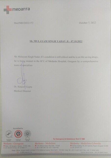 Medanta Hospital’s latest update on Mulayam Singh Yadav’s health.[/caption] 82-year-old Yadav has been under treatment at the Medanta Hospital since 22 August. He was shifted to the critical care unit of the hospital on 3 October. According to reports, earlier, Prime Minister Narendra Modi spoke to Samajwadi Party (SP) chief Akhilesh Yadav on Monday and enquired about his father Mulayam Singh Yadav’s health . On Monday, Samajwadi Party workers organised special prayers in many temples across the state for long life of the party founder. In July, Mulayam Singh Yadav’s wife Sadhana Gupta Yadav passed away. She was suffering from lung disease and was admitted to Medanta hospital in Gurugram after she complained of difficulty in breathing.