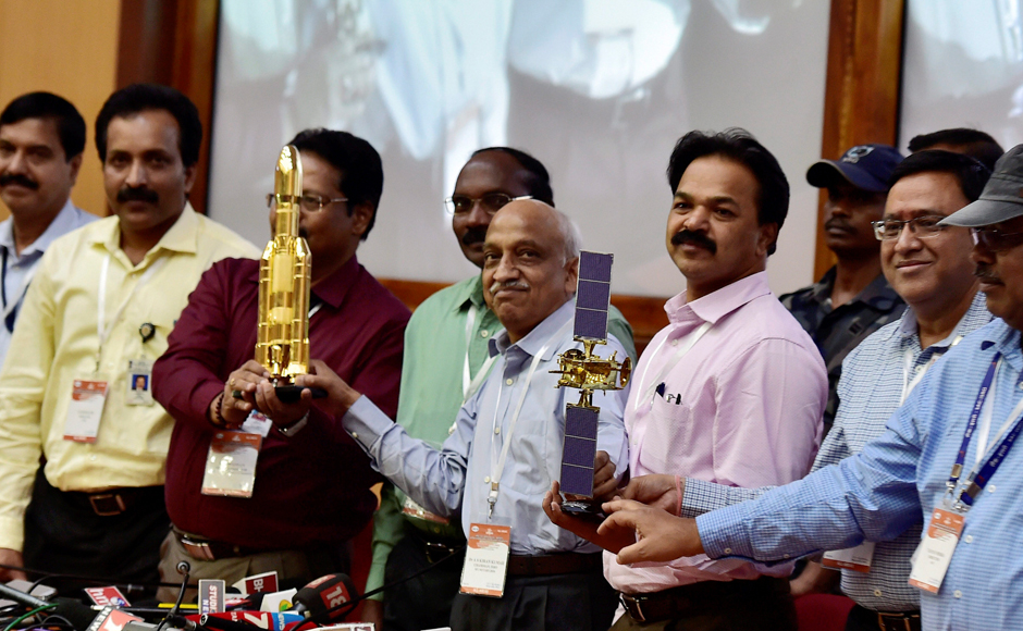 Indian Space Research Organisation (ISRO) chairman Kiran Kumar Rao displayed models of the GSAT-19 and GSLVMk-III along with scientists at a press conference after the launch of the GSAT-19 at Sriharikota. PTI