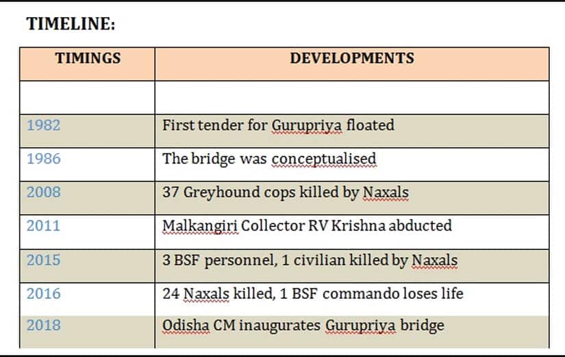 Editor’s note: Probably one of the most delayed infrastructure projects in the country, Gurupriya bridge in the Naxal-hit Malkangiri district of Odisha, was finally inaugurated last month by Odisha chief minister Naveen Patnaik. The chief minister also announced a special package of Rs 100 crore for people living in the cut-off areas. The bridge links the state’s mainland to 151 villages and nine gram panchayats that were severed when the Machkund reservoir was constructed in 1960 and the Balimela Hydro Power Project later in 1972. In this three-part series, we look at the change in lives of people inhabiting over 900 sq km of cut off area, the Maoist threat and the politics that delayed the project for over 35 years since inception. Malkangiri, Odisha: It was in June 2008, when a 64-member team — comprising Andhra Pradesh’s Greyhound anti-Maoist force and few Odisha Police personnel — was returning from a combat operation in the cut-off villages of Odisha’s Malkangiri district, that an ambush of Naxalites capsized their boats on the Sileru river and killed around 37 personnel. The rebels had apparently been emboldened by the lack of security cover in the hinterland, long severed from mainland Odisha by the Balimela Water Reservoir. The incident became a major security breach in the district known as a Maoist-infested area and part of India’s Red Corridor. [caption id=“attachment_4920831” align=“alignleft” width=“380”] ![Gurupriya bridge. Image courtesy @Naveen_Odisha](https://images.firstpost.com/wp-content/uploads/2018/08/GurupriyaBridge380NP.jpg) Gurupriya bridge. Image courtesy @Naveen_Odisha[/caption] The cut-off areas are situated near the border of Vishakhapatnam in Andhra Pradesh, where an inter-state Naxalite group is quite active. In the absence of a single concrete road or bridge to connect the 151 villages (hosting around 30,000 people) to the mainland, the Left Wing extremists were able to target the security forces through the hilltops along the river. This was not the only incident highlighting the level of Maoist threat in the area and especially to the newly-inaugurated Gurupriya bridge in Odisha, which now connects the state’s Chitrakonda block with the hinterland. In 2011, Malkangiri collector RV Krishna who was visiting the cut-off zone was abducted by the Reds near Jantapai village. Under Maoist shadow Dubbed the ‘Swabhiman Anchal’, the severed zone area borders Malkangiri, Koraput and Vishakhapatnam, and the Maoist wing that operates in the area is called the Malkangiri-Koraput-Vishakhapatnam Division (MKVD). Anti-Maoist operations here have been entrusted to specialised forces like the Special Operations Group and the District Volunteer Force under the Odisha government, and the elite Greyhounds of the neighbouring Andhra Pradesh. Several times joint operations are also undertaken together by these specially trained groups of anti-Naxal combat forces.