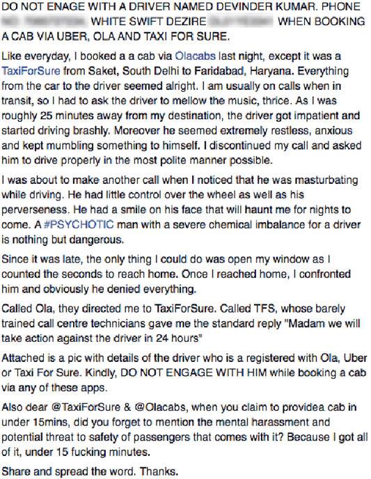 Even as the rape of a young woman in a cab operated by Uber is still fresh in public memory, a woman in Delhi has alleged that a taxi driver was masturbating in the car while driving her to her destination.  The woman has detailed her ordeal through several tweets as well as a Facebook post in which she described the incident involving a driver of a TaxiForSure cab. Here’s what she wrote on Facebook: [caption id=“attachment_2331452” align=“aligncenter” width=“533”]  Source: Facebook[/caption] The woman noticed that he was masturbating when she objected to his rash driving and asked him to drive properly. In her Facebook post, she recalled that he “had a smile on his face which will haunt me for nights to come.” She further described him as a “psychotic man with a severe chemical imbalance.” The victim was also quite scared about the driver knowing her address. “The driver knows my home and office, I feel threatened,” she said, reports IBNLive On her Twitter account, the woman later said that representatives of the company met her and told her that they had fired the driver. However, she questioned whether sacking the driver was enough. The Hindustan Times has quoted a company spokesperson saying that while the driver did not have any past record of misbehaviour, it has blacklisted him and terminated his services. Listing out the steps it has taken to ensure safety of passengers, the company has cited measures like live GPS tracking, an “Inform a Friend” feature and a 24/7 call centre team. In a statement, TaxiForSure said, “We regret the experience the passenger had, and we condemn the driver’s actions. We will continue to work closely with the passenger and will support her and the authorities in every possible manner, as and when required.” In December last year, a 25-year-old woman alleged that she was raped by a driver in a cab run by the taxi aggregator service Uber. Last month, another woman alleged that she was molested by a driver in a cab run by the same service.