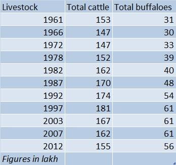 By Vidyut GK (indiaspend.org) Cows are revered in Maharashtra, protected by law against slaughter. Buffalos, on the other hand, are the bulk of the beef industry that makes India the world’s largest beef exporter. One would think that already abundant cows would thrive under such circumstances, while buffalo approached extinction. In the five decades from 1961 to 2012, the population of cattle grew 156,632 or 1.02%. The population of buffalos grew 2.5 million or 81.22%. The population of cattle was almost five (4.9) times that of buffalo in 1961. In 2012, cattle were slightly more than two and a half (2.7) times that of buffalos. Why is this so? The data from Maharashtra, correlated with events of the last 55 years, tells a larger story: Bans on cattle slaughter – now in force in 24 of 29 states (Maharashtra widened and enforced its ban earlier this year) – may actually be a disincentive to cattle farming. The story begins with the widely differing sex ratios of cattle and buffalo in Maharashtra. [caption id=“attachment_2508572” align=“alignleft” width=“380”]  Representational image. Image courtesy: AFP[/caption] The ratio of male to female cattle has hovered between 58% and 47%, with the lowest sex ratio in 2012. The ratio of male buffalo to female buffalo consistently hovers between 8% and 18%. At no point does the male buffalo population reach even 20%. This is the difference that determines profitability. It is the difference that ensures scarce resources, such as pastures, fodder, water and shelter, go to the most productive livestock; and ensures that resources are freed for new, productive livestock. The population of male cattle is consistently higher than female cattle, initially, with a gentle rise in both, cows growing in number marginally faster than bulls and bullocks. This made sense before the popularisation of motorised transport, with bullocks being used for transport. Even in the absence of a cow-slaughter law, farmers did not cull productive cattle. The slowing growth of cattle coincides with the emergence of motorised transport in India. Cattle slaughter has never been popular in Maharashtra, due to religious sentiments. When bulls and bullocks lose utility, the overall growth slows, with farmers reluctant to breed animals. Unproductive cattle, as we mentioned, prevent growth of the business by increasing expenses, occupying resources and preventing acquisition of productive cattle. Buffalo suffered no such handicap, with males consistently culled to provide meat. This not only frees resources for productive buffaloes to be bred or purchased, it provides the farmer additional income and adds to the profitability and thus viability of the business. Cattle population started dropping after 1997 What else was happening in the agricultural world around that time? Maharashtra’s post-economic liberalisation agrarian crisis was by now full blown. By 1995, journalist P. Sainath’s reports of farm suicides had triggered enough alarm that they started being recorded in NCRB data from that year on. Economic liberalisation and “development” rapidly reduced pastures and forest land. Livestock, as an economic asset and buffer against poverty, appears to have lost potency by 1997.  As farmers committed suicide, cattle-population growth declined, but there was no major slaughter of bulls and bullocks (which would have been reflected as a drop in the sex ratio). Overall population started dropping steadily, as cattle farming became unviable. This means breeding slowed to accommodate the drop in resources. One of the worst droughts to hit Maharashtra came along in 2012, preceded by conditions that made it occur: 10 years of spending on irrigation and continuously expanded budgets of projects had resulted in virtually no increase in irrigated land; this became famous as the irrigation scam. Water resources were over-allocated, rampant drilling of borewells lowered the water table. Buffalo have higher water requirements than cows. So, buffalo owners appear to have sold off their livestock in unusually high numbers. This is probably also a factor in India becoming the world’s largest exporter of beef at that time. These would be imported dairy breeds with high production. Their requirements of water would be less than buffalo, and milk yields would be higher. Indigenous cows, on the other hand, barely produce enough to justify a business, if it also means supporting unproductive cattle with the small profits. Those continued to diminish. The rise in the number of exotic and crossbred cows (usually Jersey or similar breeds, as well as their crosses with Indian cattle, reared for dairy), combined with the highest drop in male cattle also belonging to the same category, shows that for the first time in Maharashtra, the more progressive dairy businesses had understood why Dr. Verghese Kurien, the man behind India’s dairy revolution, advocated culling of unproductive cattle. They were reconciling with a pragmatism in their business model with the slaughter of unproductive males, who have greater dietary requirements, and are less suitable for work than hardy, indigenous cattle breeds. (This slaughter of male cattle certified unfit for work, was legal till the law was expanded this year for all cattle, although the numbers indicate that a few rules may have been bent with regard to age and fitness for slaughter.) In the absence of slaughter bans, cattle farming more profitable than buffalo farming As we said, buffalo require more care, water and suffer more in drought, for comparable quantities of better quality milk. In the absence of slaughter bans, cow beef is more palatable and thus priced higher than carabeef. With no bans, this would add to the income of the cattle farmers and make it sustainable. This adoption of culling, forced by adversity, had potential to transform dairy farming, but it did not last. This year, the BJP-Shiv Sena government cleared a stric