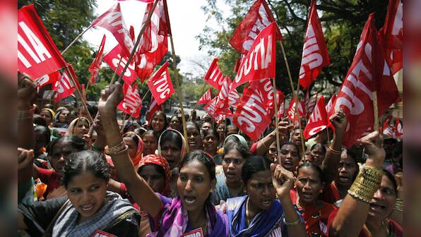 Activists of All India Trade Union Congress (AITUC) shout slogans as they sit on rail tracks to stop trains on the first day of a two day strike in Bhubaneswar. AP