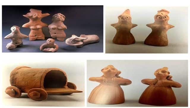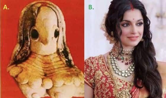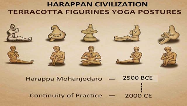 In terms of archaeological evidences from the Indian subcontinent, swastika motif has been found from pre-Harappan times, as for example, on a potsherd from Rehman-Dheri (Khyber Pakhtunkhwa province). Seals dated around 2100 BCE showing swastikas have been found from the Mohenjodaro site, while the motif is frequently seen on ornaments and beads found from various sites of the Sindhu-Saraswati civilization, including on pottery from the Shahi-Tump site (Balochistan). The Navdatoli site beside the Narmada river in Madhya Pradesh (chalcolithic culture) has also yielded varying forms of the swastika symbol on pottery; while paintings of the swastika motif have been found from the Ganga-Yamuna doab area sites (Iron Age culture). Potteries and sherds depicting swastikas from Sonkh (2nd century BCE); to tablets, coins, and seals from Mathura belonging to the Kushana period (1st century CE), the swastika motif has remained a constant in Indian art from pre-historical to the historical era without any break. It still continues to remain a religious symbol in the 21st century postmodern India. [caption id=“attachment_10168581” align=“alignnone” width=“640”] ![Seal found at Harappa depicting a swastika](https://images.firstpost.com/wp-content/uploads/2021/11/seal.jpg) Seal found at Harappa depicting a swastika[/caption] Worship of mother goddesses In all ancient cultures, women were seen as the foundation pillars upon whom rested the important tasks of giving birth and rearing the young, and imbibing in them the prevalent social norms, culture-heritage, behavioural habits, and traditions. The women were seen as life producers with regenerative capacities, hence her organs that helped in procreation became the symbols of new life, and motherhood became the core figure in religious cults of those times. The paleolithic female figures found in abundance from various excavation sites show the popularity of Mother Goddess worship in prehistoric times; a religious practice that evolved with time and still remains popular in India as the worship of Shakti or the feminine principle. [caption id=“attachment_10168591” align=“alignnone” width=“640”] ![Mother goddesses from pre-Harappan era, Mehrgarh](https://images.firstpost.com/wp-content/uploads/2021/11/mothergoddesses.jpg) Mother goddesses from pre-Harappan era, Mehrgarh[/caption] Looking at Harappan times we come across various seals and artefacts, which according to the British archaeologist John Marshall belonged to the Mother Goddess cult, evident from the baetylic stones, ring stones, and phalli found in abundance from the various excavated sites. The Mother Goddesses discovered from India and modern Balochistan were typically represented as female figures with broad hips, narrow waists and heavy breasts to denote fertility and child bearing power. Besides the Mother Goddess figurines, a terracotta oblong seal was discovered from Harappa which shows a female figure (a deity) upside down, legs wide apart, a plant issuing from her womb, and arms in the same position as the Pashupati seal figure (vegetative fertility). This Harappan seal is easily comparable to the later terracotta reliefs from Bhita site of early Gupta period that show the Goddess in the same position with a lotus coming out from the neck instead of her womb (Lajjagauri or Aditi Utanapad). Devis in similar sitting position with legs wide apart have also been found from Bhita site and belong to the earlier Kushana era. These figures are symbolic of fertility and creation of new lives and carry with them the same concept of the Harappan Mother Goddesses. This association of the devi with vegetation matches the Shakamabhari concept found in Devi-Mahatmya of Markandeya Purana where the devi provides nourishment for all famine afflicted people from her own body. Here one interesting cultural aspect to note is that the Mohenjodaro Mother Goddesses mostly have a red slip or wash paint over them (including red colour in the hair parting). The red colour is associated with female fertility, and red ochre was often used by women (across all ancient cultures) to colour their bodies in order to improve their fertility. In India the cultural practice of using red colour is still seen among Hindu women who wear vermilion (sindoor) after marriage, signalling their bindings to one man and the readiness to procreate. [caption id=“attachment_10168601” align=“alignnone” width=“560”] ![A: Figurine with red colour in hair parting from Nowshera (Balochistan 2700 BCE). B: Continuing tradition with the same underlying meaning of the colour red. Image from Google for representation purposes only. ](https://images.firstpost.com/wp-content/uploads/2021/11/sindoor.jpg) A: Figurine with red colour in hair parting from Nowshera (Balochistan 2700 BCE). B: Continuing tradition with the same underlying meaning of the colour red. Image from Google for representation purposes only.[/caption] Yoga mudras and other art forms From the famous Proto Shiva seal showing a figure sitting in Mulabandhasana to namaskara mudras and other yoga postures, all these postures continue till date and are an essential part of yoga practices. This is well explained in the given image. [caption id=“attachment_10168611” align=“alignnone” width=“640”] ![Image from Google](https://images.firstpost.com/wp-content/uploads/2021/11/yoga.jpg) Image from Google[/caption]