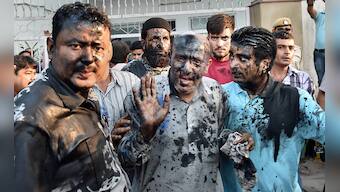 Jammu and Kashmir MLA Abdul Rashid Sheikh's face was blackened by few activists, allegedly belonging to a right-wing organisation Hindu Sena, at Press Club in New Delhi on Monday. PTI