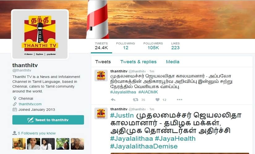 At around 5.30 pm, local media channels began reporting the demise of Tamil Nadu Chief Minister J Jayalalithaa. Namely, Thanthi TV and Puthiya Thalaimurai, which later retracted the information.