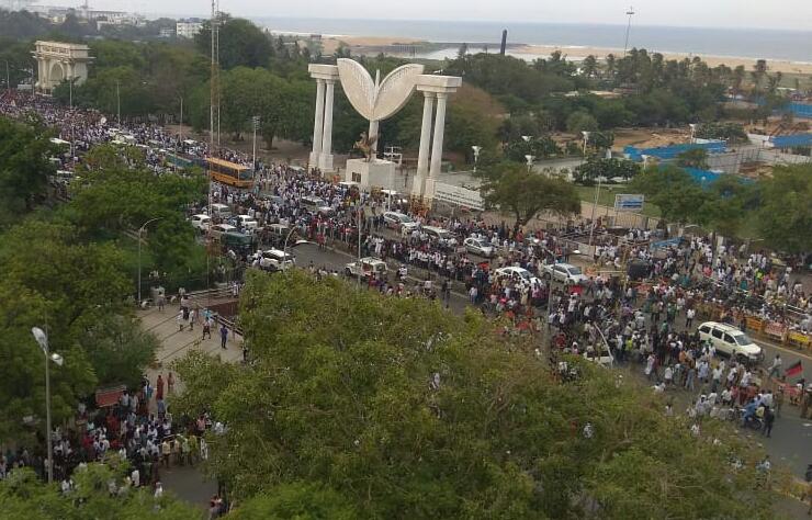 DMK patriarch M Karunanidhi’s mortal remains. Image Courtesy: Dhanabalan/ 101Reporters[/caption] National politicians, including Prime Minister Narendra Modi and West Bengal Chief Minister Mamata Banerjee, are expected to arrive in Chennai to pay their last respect to Karunanidhi at Rajaji Hall. Other chief ministers Kumaraswamy, Chandrababu Naidu, Oommen Chandy, Akhilesh Yadav, Arvind Kejriwal are also expected to arrive to pay homage to the DMK chief. As leaders of Tamil Nadu make beeline to pay homage to DMK chief M Karunanidhi, thousand of Kalaignar supporters have been raising slogans, “Marina venu (We want Marina)”, demanding that the DMK chief be laid to rest just like other political stalwarts of the state. Reports have said that Tamil Nadu is on high alert. AIADMK’s rebel leader TTV Dhinakaran was the first to pay homage to Karunanidhi. “I don’t want to comment on giving space to Kalaignar at Marina. This is not the time for politics. Karunanidhi is a tall leader. It would not be appropriate to comment on it, since, the Madras High Court has seized of the matter at 8 am. I hope things will be fine,” Dhinakaran told reporters. Actor Rajinikanth reached Rajaji Hall to pay his last respects to DMK chief Karunanidhi. Rajinikanth, who arrived later on Tuesday, had failed to get past the massive crowd outside the residence and enter the residence. Rajinikanth reached Karunanidhi’s residence late on Tuesday night but had to return without seeing the Dravidian politics stalwart. Reports said that the mortal remains of Karunanidhi has left the CIT Colony home for Rajaji Hall where thousands await their leader’s last journey. DMK supporters who are present in hordes at Rajaji Hall said that they were confident that the Madras High Court will allow them to bury their Kalaignar at the Marina Beach in Chennai. Karunanidhi’s son MK Alagiri, DMK leader A Raja and TTV Dhinakaran arrived at Rajaji Hall, reports said. Within minutes of Karunanidhi’s death, a huge row erupted after the state’s AIADMK government rejected the demand of the DMK, its long-standing political rival in state politics, for land on the famed sands of the Marina beach where he could be buried. The Madras High Court will decide at 8 am whether the DMK chief be laid to rest along with other political stalwarts like Annadurai and MGR. As the clamour to give DMK chief M Karunanidhi a burial at the Marina grew, Makkal Needhi Maiam president Kamal Haasan tweeted in support of Karunanidhi’s burial at the Marina beach and said, “When Anna was alive, it was Kalaignar and MGR as two brothers who worked hard to strengthen the party. It is only just that all three are allowed to rest nearby. It is sad, that people who came into the party after MGR do not possess that noble quality. Had MGR been alive and Kalaignar had passed away, MGR would have made Kalaignar to rest next to Anna.” Leading politicians have supported the DMK claim. “AIADMK is playing petty politics,” DMK supporters told reporters outside the CIT Colony home of the late DMK supremo. The Madras High Court has adjourned hearing on a DMK plea to allot space on the Marina beach for burial of party leader M Karunanidhi who breathed his last on Tuesday at a Chennai hospital. The hearing is likely to begin at 8 am on Wednesday and the verdict is expected by 8.30 am. The DMK moved the court hours after the Tamil Nadu government announced its inability to allot burial space on the Marina beach citing legal hurdles. In a special late night hearing before the first bench, comprising Acting Chief Justice Huluvadi G Ramesh and Justice S S Sundar, the counsel for DMK questioned the government’s legal ground for not allotting space for burying Karunanidhi at the Marina beach. Hearing the matter, Acting Chief Justice Huluvadi G Ramesh adjourned it to 8 am. The DMK argued that there was no legal impediment to allotting space within the memorial of former Chief Minister C N Annadurai on the beachfront. Senior counsel for the state government, making their submissions, said they would get instructions and file a counter in the morning. In his observations, the acting chief justice told the government counsel that “every minute of delay” may cause problems to the government and asked if it was prepared to handle it. He also said Karunandihi was among the tallest leaders of the country and asked what was the problem in allotting a burial site for him at the Marina. While the special hearing was held at the acting chief justice’s residence here, the matter, which was adjourned, will be heard at the court in the morning. Advocate G Doraisamy (Periyar Dravidar Kazhagam) and PMK advocate K Balu submitted before the bench that they were withdrawing their petitions against construction of a memorial for Chief Minister J Jayalalithaa at the Marina beach. This will remove legal hurdles for the government allowing a site for Karunanidhi, they told reporters later. Counsel for DMK P Wilson and Saravanan had earlier gone to the residence of the acting Chief Justice and sought permission to move an urgent motion. The acting chief justice directed them to serve notice on the advocate general, saying he would hear the case at 10.30 pm at his residence. Earlier, DMK working president M K Stalin, recalling the long public life of Karunanidhi, had written to Chief Minister K Palaniswami seeking space inside the mausoleum complex of the departed leader’s mentor C N Annadurai at the Marina. A government statement said it was “unable to allot space at Marina beach owing to several pending cases in the Madras High Court and legal complications.” Hence, the government is prepared to allot a two-acre site on Sardar Patel Road near the memorials to Rajaji and Kamaraj, it said.