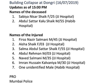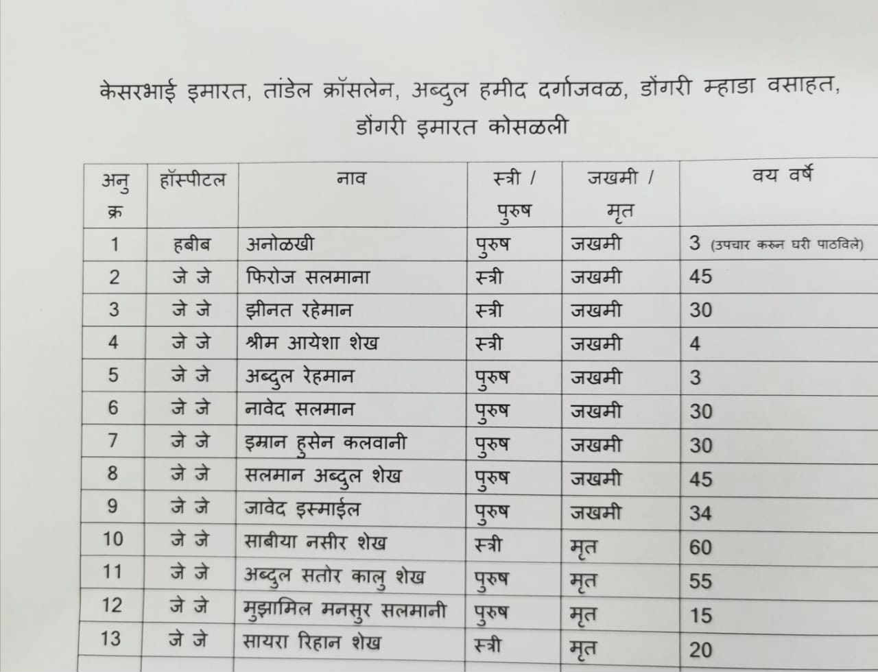 Mumbai Dongri Building Collapse LATEST updates: The death toll has risen to five. The Maharashtra Housing and Area Development Authority (MHADA) has put out a statement saying that the collapsed building in Dongri did not come in its purview. BMC commissioner Praveen Pardeshi, who is at the site of the collapse, told reported that the incident is tragic and it shouldn’t have happened. Rescue and relief operation is are our priority. Fire Brigade, NDRF are doing their job," he said. The trustee of the Kesarbai Building, S Hussain, was quoted by CNN-News18 as saying that the building which collapsed — reportedly the ‘B wing’ of the entire complex — was an illegal structure. He also said that the building was constructed in 1986 and that the redevelopment was halted because tenants “refused to pay the redevelopment charges”. While some media outlets like the Press Trust of India reported that 12 people had died in the Dongri building collapse, The Indian Express quoted the Mumbai Police PRO as having identified two people who died. Vishwanath Mahadeshwar visited the site and said that the search and rescue operation was “priority” at the moment, even as he fielded questions about who was to be held accountable for the incident. “We will conduct an investigation into the incident, but now only the search and rescue operation is the priority,” he said. According to the report drawn up by the BMC on the Kesarbai building in 2017, the building was categorised as ‘C1’, which implies that it must be evacuated immediately and be demolished. The building collapse in the Dongri area has been classified as a level-2 disaster by authorities, reports said. In addition, many women are likely to be among the 40 to 50 people trapped in the debris, CNN-News18 said. Maharashtra chief minister Devendra Fadnavis issued a statement about the Kesarbai building collapse: “Affected building is 100 years old, but wasn’t included in list of dangerous buildings. The building had been given to the developer for redevelopment. The work to get rescue those stuck under the debris is being carried out on a war-footing.” The Mumbai Police issued a statement on the “unfortunate” incident of the building collapse in Mumbai’s Dongri on Tuesday. “Humble request to citizens to stay away from the incident spot to facilitate effective rescue operations by authorities. A green corridor has been provided for all emergency services and rescue operations,” the statement said. Reports said that the NDRF teams have reached the spot of the building collapse after facing difficulties in accessing the area. They were reportedly provided a ‘green corridor’ to aid in reaching the spot. BMC was quoted by reports as saying that five people have been rescued, however, two have died in the accident. As the NDRF teams are facing difficulties to reach the spot of the building due to narrow lanes, locals have formed a human chain to help to clear the debris as search and rescue operations are ongoing. The BMC has said that more than 40 people, or 10 to 15 families have been trapped under the debris of the building collapse in Mumbai’s Dongri. Locals are also contributing to the rescue operations as the area is difficult to access due to narrow lanes and dense structures. A four-storey building in Mumbai’s Dongri area collapsed on Tuesday afternoon, and more than 40 people are feared trapped under the debris. A team of the National Disaster Response Force (NDRF) has been rushed to the spot, however, the area is reportedly difficult to access because of narrow lanes. Reports said that the incident occurred at 11.40 am. The structures in the area are old and dilapidated and reportedly, redevelopment work was also happening on some buildings in the locality. The BMC’s disaster management cell was quoted by ANI as saying that the Kesarbai Building on Tandel Street in Dongri collapsed, but the reason for the accident was not specified. Fire tenders have been sent to the site, adjacent buildings are being evacuated.