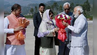 Prime Minister Narendra Modi being received by the Jammu and Kashmir Governor NN Vohra and the chief minister Mehbooba Mufti upon his arrival in the state on Sunday. PTI