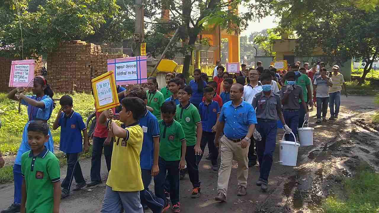 KV students and teachers plogging on the 150th birth anniversary of Gandhiji. Image: Kendriya Vidyalaya Sanghatan[/caption]