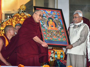 Gaya (Bihar): Bihar chief minister Nitish Kumar on Sunday called on Tibetan spiritual leader the Dalai Lama at Bodh Gaya near Gaya and also released a book with him. The Dalai Lama, who has been at Bodh Gaya since 2 January, received the chief minister at the Kalachakra Maidan and presented him with a picture of the Buddha and an “Angavastram” (traditional men’s attire) as tokens of blessing. [caption id=“attachment_4291893” align=“alignleft” width=“380”]